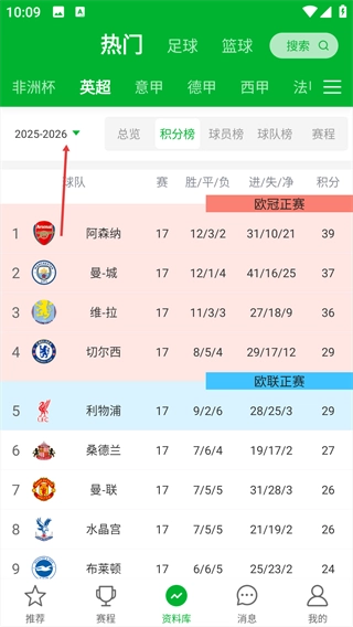 进入资料库页面后,点击上方的年份图标,即可查看对应联赛的积分榜数据。