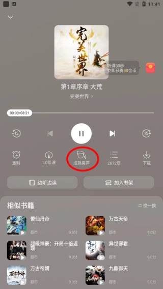 即可开始听书,点击图示位置切换阅读声音。