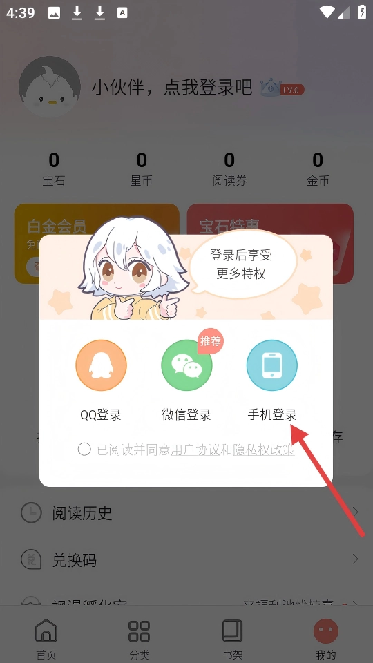 点击登录按钮后,你可以选择【手机登录】的方式,只要勾选相关协议就能完成登录操作。