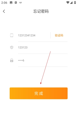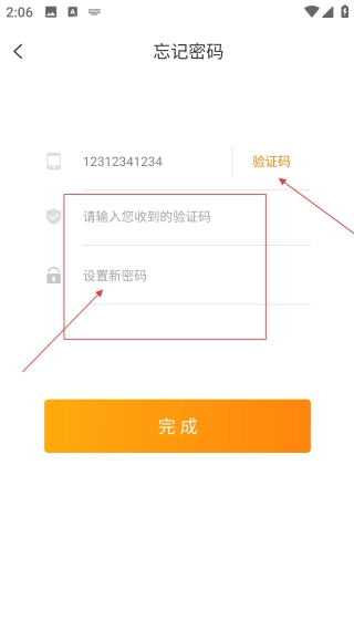 在忘记密码页面,点击【验证码】按钮获取验证码后,填写【验证码】和【密码】以完成信息补充。