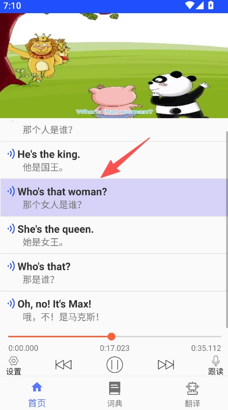 进入单元内容后,点击跟读,学习英语内容。