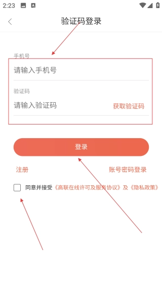在填写页面,输入相关信息并勾选协议后点击登录按钮,就能完成账号登录流程。