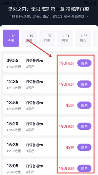 在放映场次列表页面,挑选合适的场次后,点击页面右侧的“购票”按钮,即可完成购票流程。