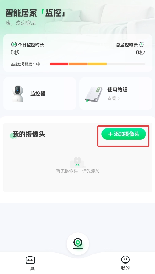 启动远程监控功能后,在首页找到并点击“添加摄像头”按钮,即可进入设备配置流程。