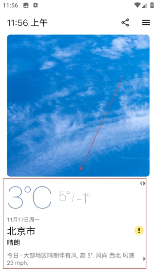 进入天气界面后,能够【查看北京市的实时天气情况,涵盖温度、风向与风速】等信息,体验天气查询服务。