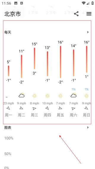 进入每日天气页面,能【查看未来几日的气温、天气情况、风力大小】等信息,以便合理安排出行计划。