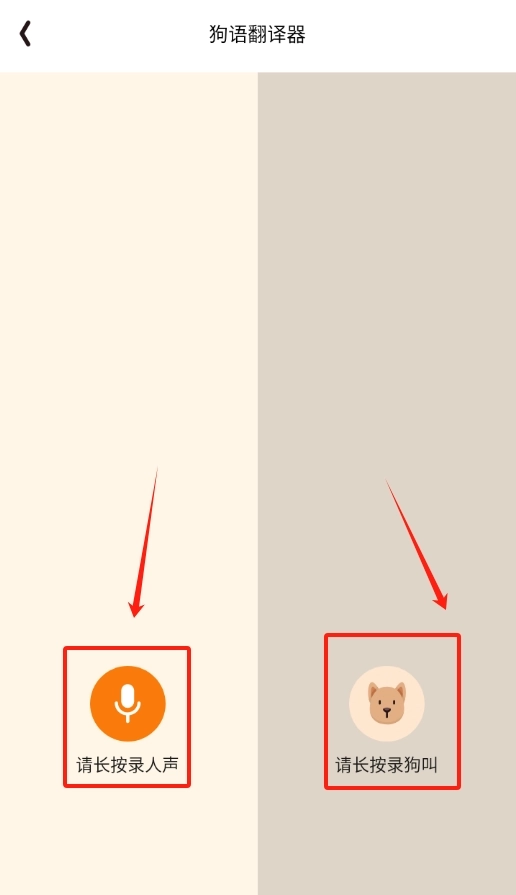 要是想和狗狗沟通交流,操作方式也是相同的,只需点击狗语翻译器,然后长按录音按钮,就能完成人声和狗语之间的转换啦。