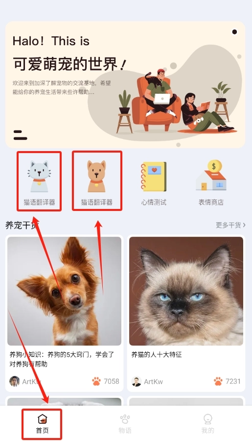 打开萌宠物语软件,进入首页后,猫语与狗语翻译器的功能模块十分醒目。
