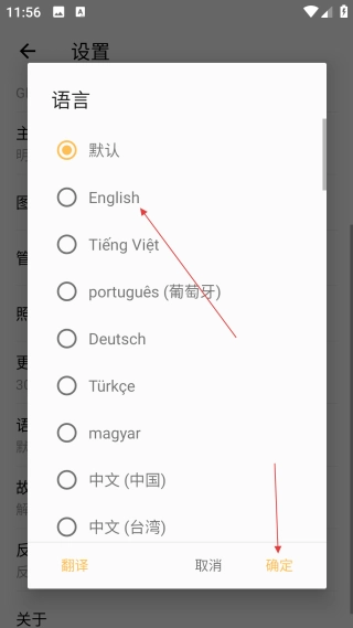 在语言选择的界面里,挑选【English】选项,再点击【确定】按钮,就能把应用的语言设定成英语了。
