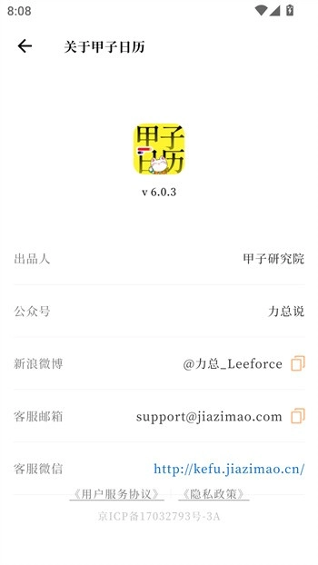在“我的”页面的“关于甲子日历”里,你可以查看用户服务协议和隐私政策。