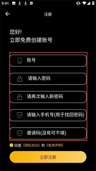 在注册页面填写账号、密码等相关信息,勾选对应的协议后,点击【立即注册】按钮即可完成注册流程。