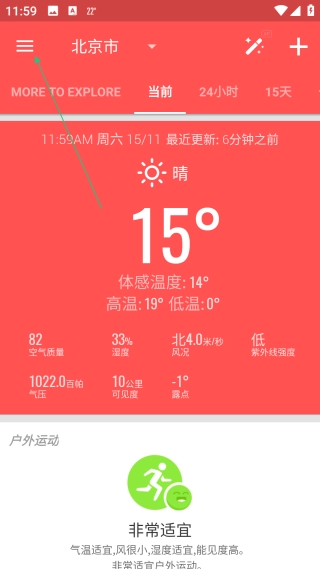 在天气应用的界面上,点击【左上角的菜单按钮】,就能进入功能菜单界面。