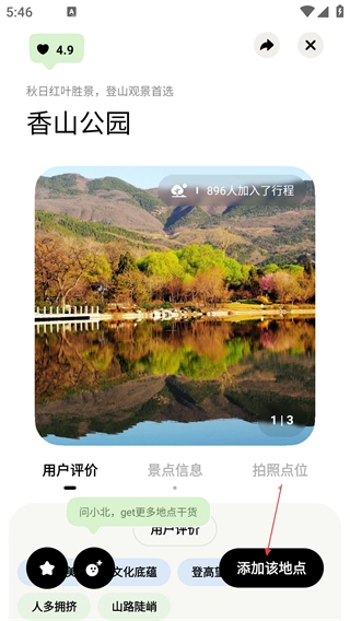 在探索页面,点击目标景点的条目(例如“香山公园”),即可进入该景点的详情页面。