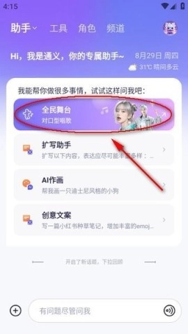 打开进入后,在“全民舞台”板块点击“对口型唱歌”选项,随后选择“全民唱演”分类,再从“爆款热歌”专区里挑选一个合适的模板。