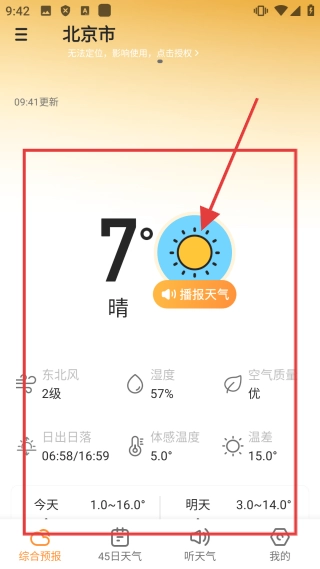 进入听天气界面后,点击【播报】按钮,就能听取北京市的天气情况,体验语音播报天气带来的便捷服务。