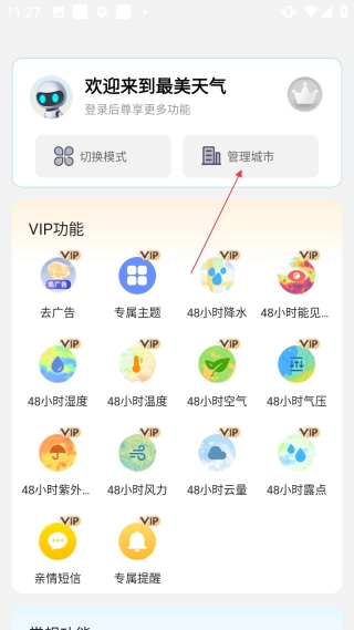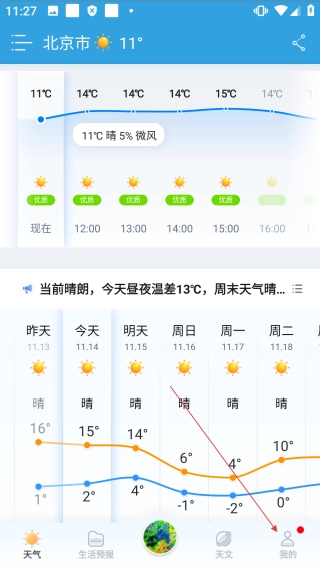在天气界面,点击右下角的【我的】按钮,即可进入个人功能界面。