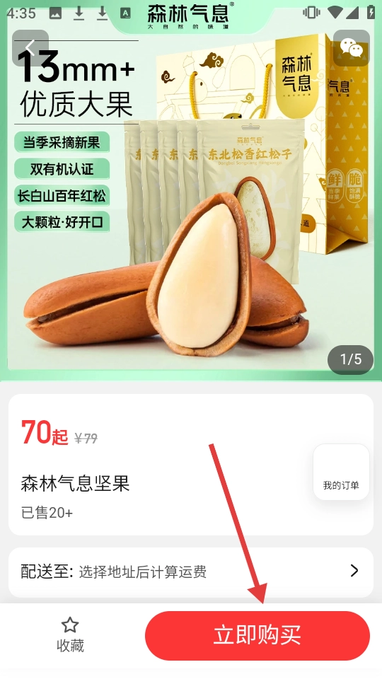 在【森林气息坚果】页面,点击【立即购买】按钮,即可进入购买流程。