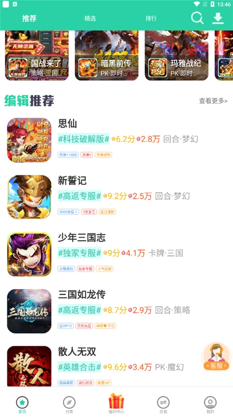 2、进入应用界面后,可看到【首页】、【分类】、【福利中心】、【交易】与【我的】这几个栏目。在【首页】界面中,游戏被划分为“推荐”“精选”“排行”和“搜索”几个板块,这里我们以“搜索”功能为例,点击界面右上角的“放大镜”图标即可。