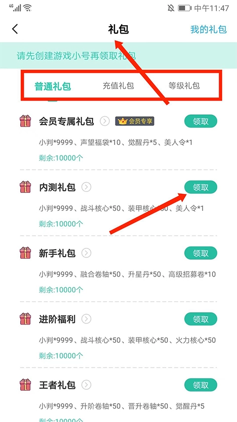 11、在【礼包】界面中,你可以选择领取“普通礼包”“充值礼包”“等级礼包”,这些礼包能让你的游戏体验更轻松。