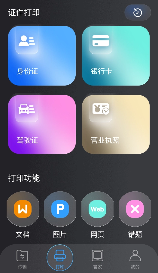 可选择证件、文档、照片等打印类型,还具备身份证复印排版、A4文档无线打印等专业功能。