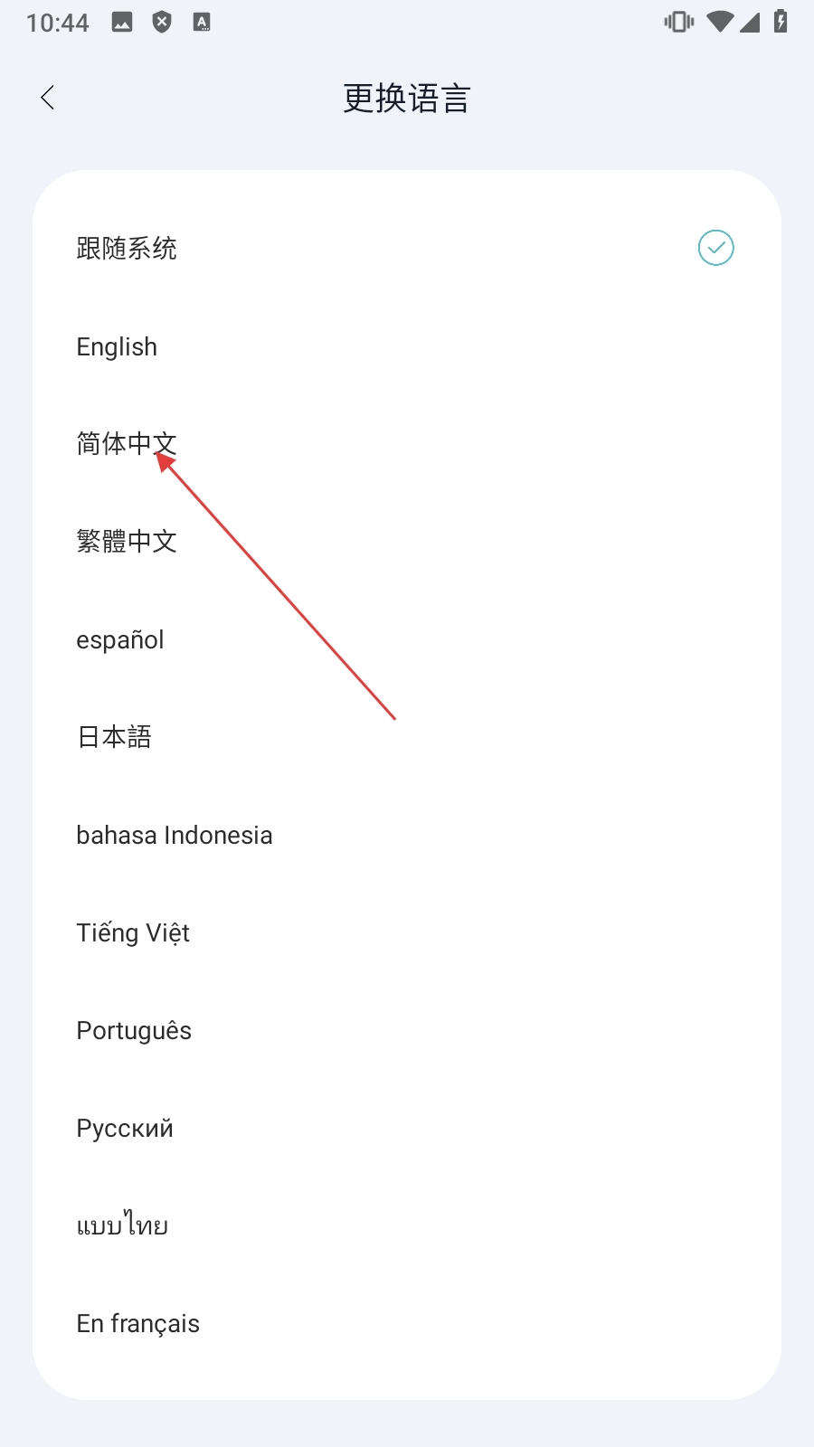 在个人页面,点击【更换语言】按钮,即可进入语言选择页面。