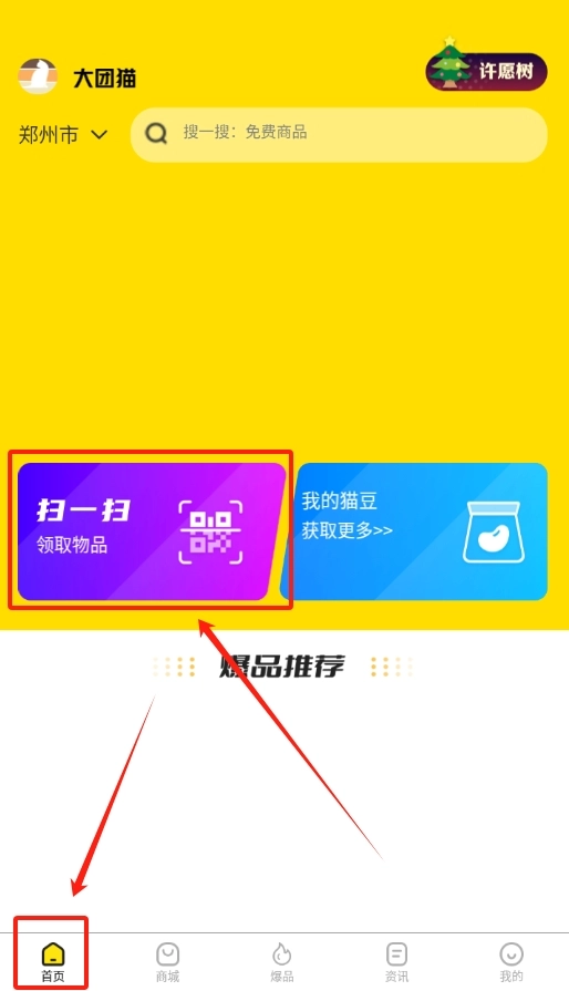 登录成功后回到首页,点击首页的“扫一扫”功能,用它对准设备进行扫码就能领取物品了。