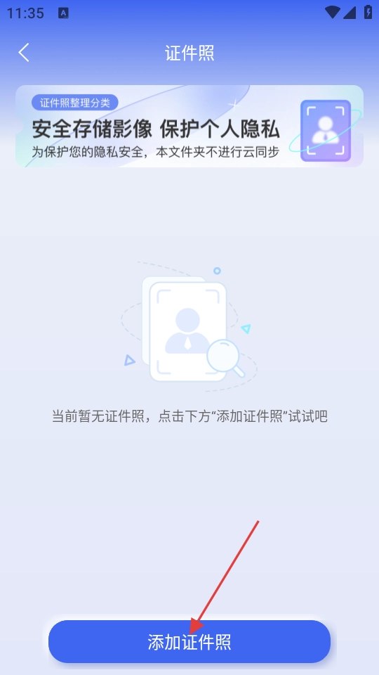 在证件照页面里,点击【添加证件照】按钮,就能完成证件照的添加操作。