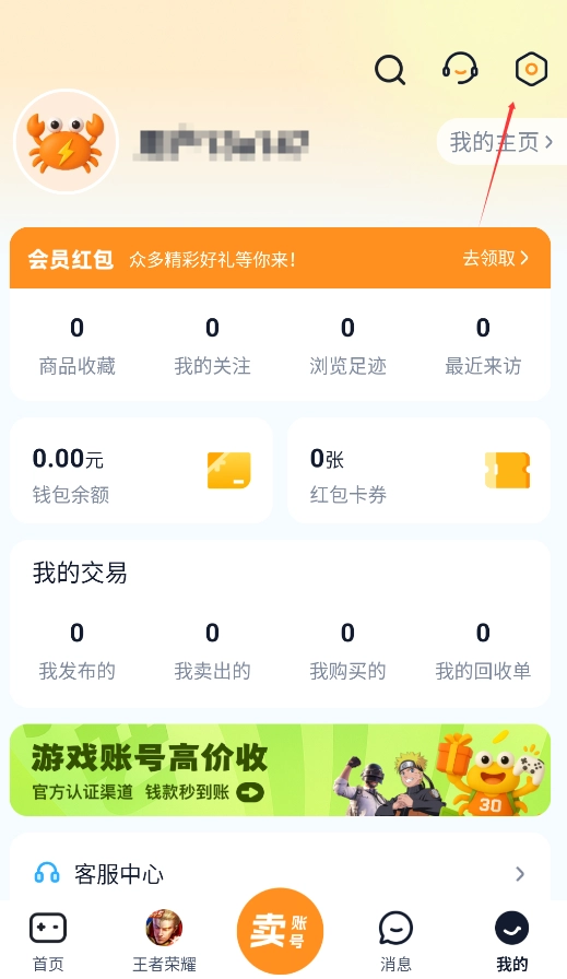 启动后,进入“个人中心”页面,点击右上角的齿轮设置图标。