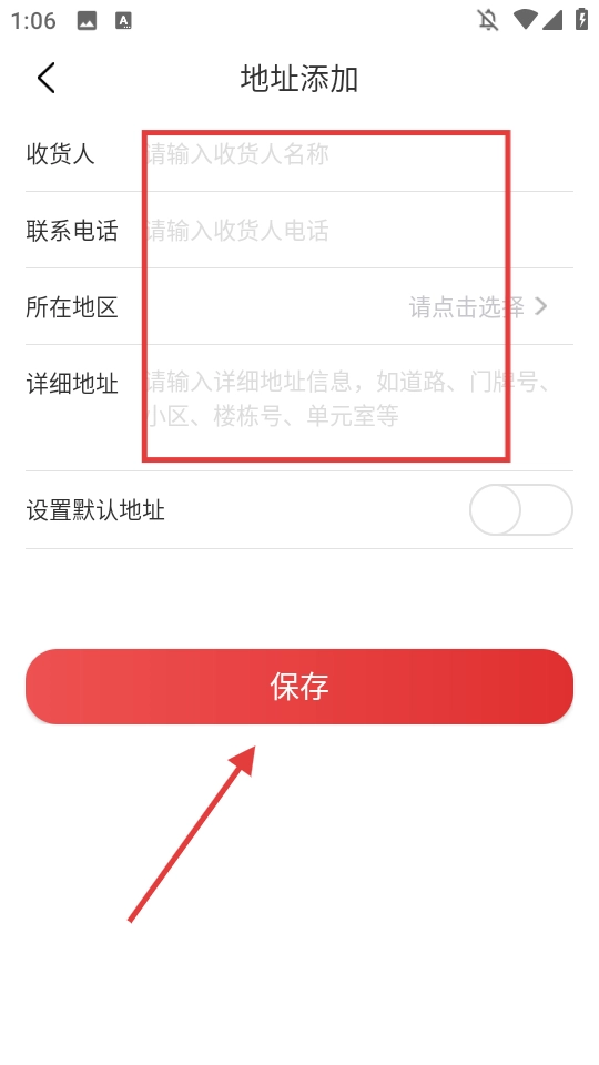 请填写【收货人】、【联系电话】、【所在地区】、【详细地址】等相关信息,所有信息填写完毕后,点击【保存】按钮即可。