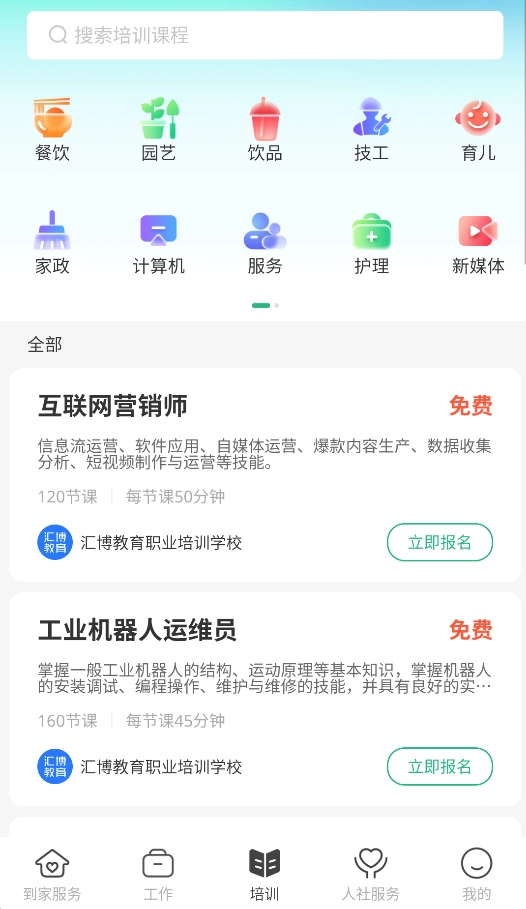 在“培训”板块挑选餐饮、家政类课程,完成报名后就能得到线下培训的具体地址以及考证相关的指引。