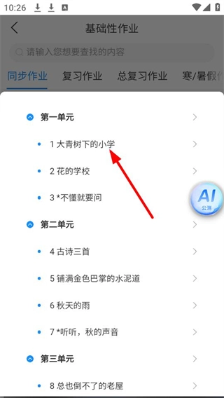 在基础性作业的同步作业列表里,点击【1大青树下的小学】就能进入作业页面。
