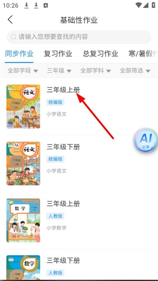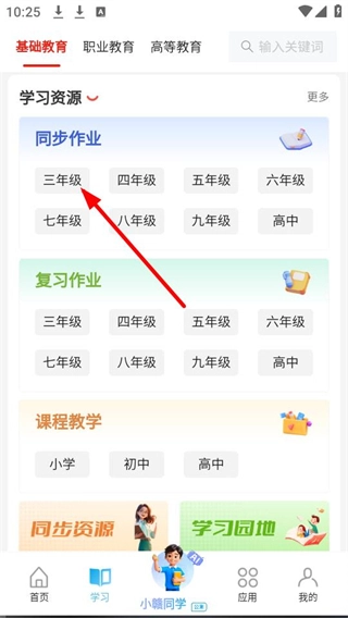 在学习资源的同步作业板块里,点击【三年级】就能进入三年级作业的选择界面。