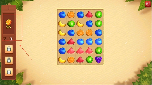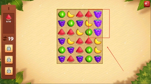 屏幕左侧呈现当前目标和进度,下方是三消区域,通过滑动交换水果方块来达成消除,右侧则排列着助推器与道具按钮。