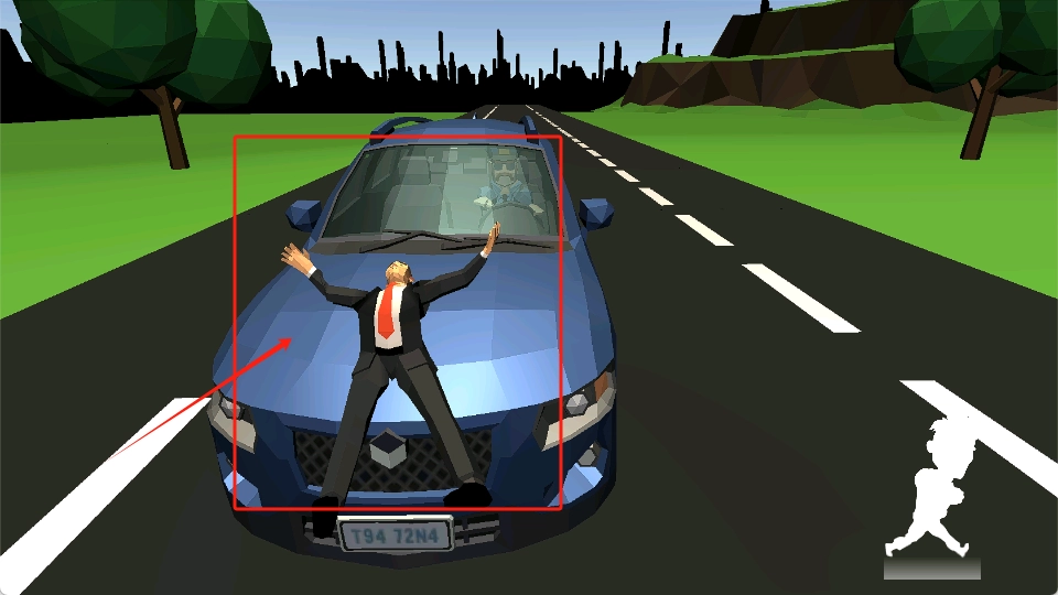 等蓝色汽车开过后,点绿灯按钮让躺着的人过马路。