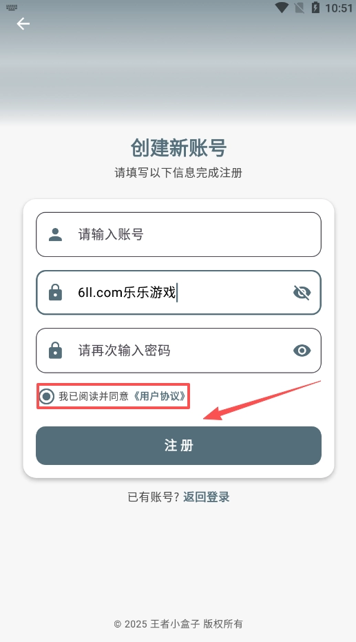 2、填写用户本人使用的注册账号和密码等相关信息,接着勾选用户协议,最后点击底部的“注册”按钮完成操作。