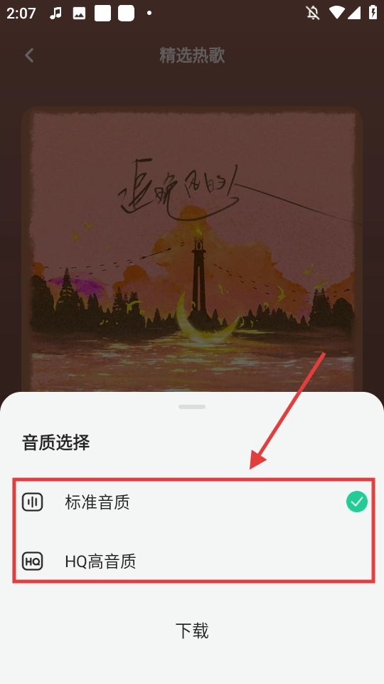 在页面里挑选音质(标准音质或者HQ高音质),点击【】,就能完成歌曲相关操作。