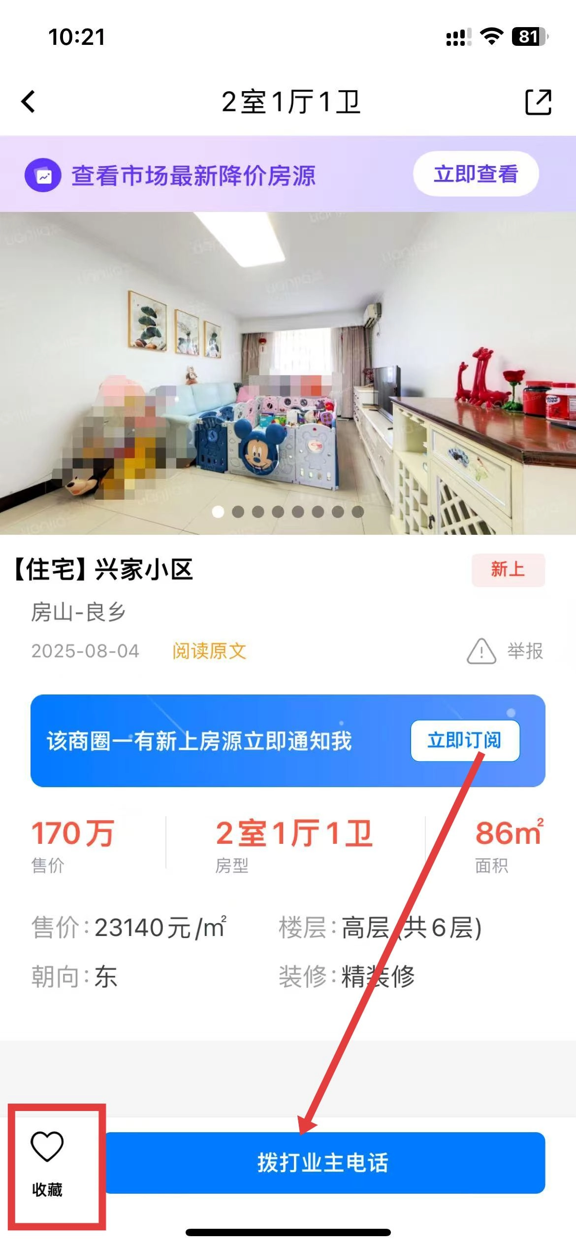 在房源详情页面,您能够点击【收藏】按钮来收藏该房源,也可以点击【拨打业主电话】按钮与业主进行沟通咨询。