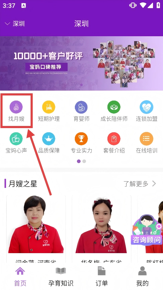 打开首页后,点击【找月嫂】的图标,即可进入月嫂列表页面。
