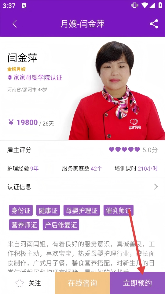 在月嫂详情页面查看完具体信息后,点击页面右下角的【立即预约】按钮,即可跳转至登录页面。