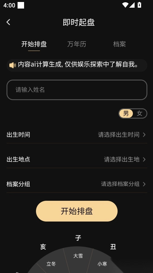 5. 接着输入性别信息(男性或女性)、出生的具体时间以及档案分组,之后点击“开始排盘”按钮,这样就完成操作了。