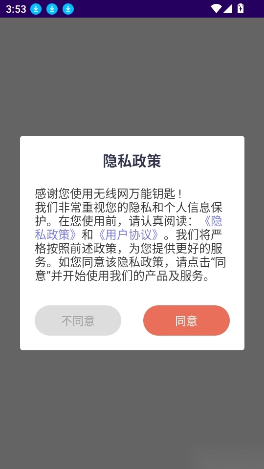 1、首先打开应用,阅读完“隐私政策”后点击“同意”按钮进入应用。