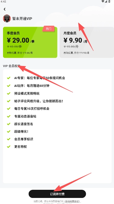 3、支付对应费用开通季度或月度会员后,即可发送语音消息。