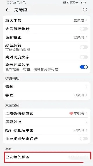 2. 系统会自动跳转到手机的无障碍设置界面,此时需要点击【已安装的服务】选项,以进入对应的功能页面。