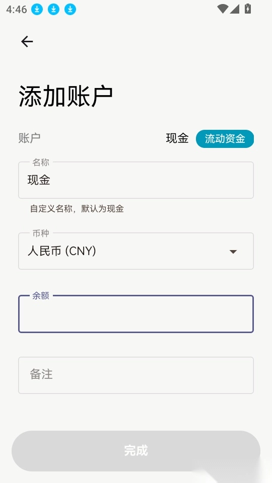 5、输入账户余额后,点击“完成”按钮,即可成功添加账户。