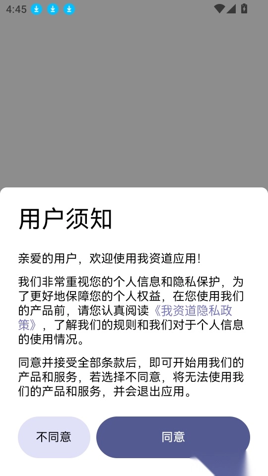 1、首先打开应用,阅读完“用户须知”的内容后,点击“同意”按钮进入应用内。