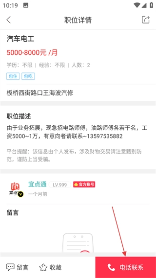 3、在职位详情页面,点击“电话联系”按钮,即可与招聘方取得联系以求职。