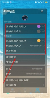 4、在【操作设置】界面,我们能够对开机自启、菜单大小、自动缩小等多项功能进行配置;若想深入掌握软件的使用技巧,还可点击“使用技巧”按钮跳转查看。