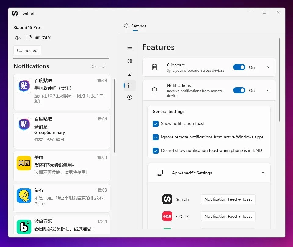 4、功能集成:把剪贴板同步、文件传输、通知同步等实用功能整合起来,一站式满足跨设备使用需求。