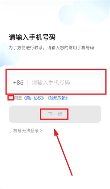进入登录页面后,输入手机号码,勾选同意《用户协议》和《隐私政策》,点击下一步就能完成登录操作。