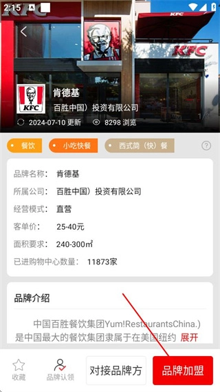 在品牌加盟页面,点击目标品牌后,即可进入该品牌的详情页面。